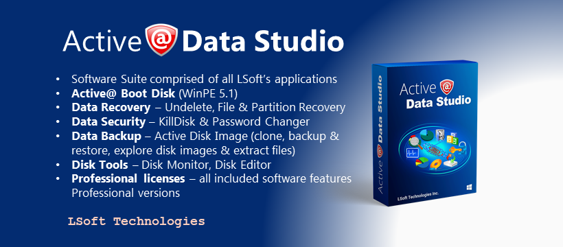 Active Data Studio 24 is a set of desktop applications and a bootable CD/DVD or USB Disk for booting up any system into a Windows Recovery Environment.