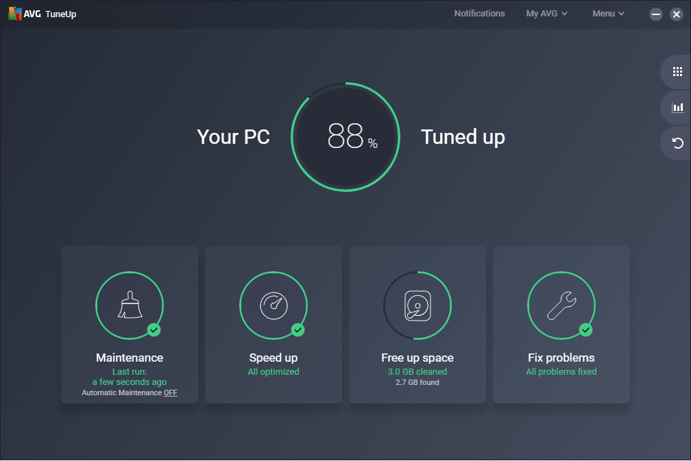 AVG Tuneup’s Fix Problems center is a 24/7 mechanic for your PC. It helps fix and prevent problems with Windows, your hard disk, your programs, and accidentally deleted files.