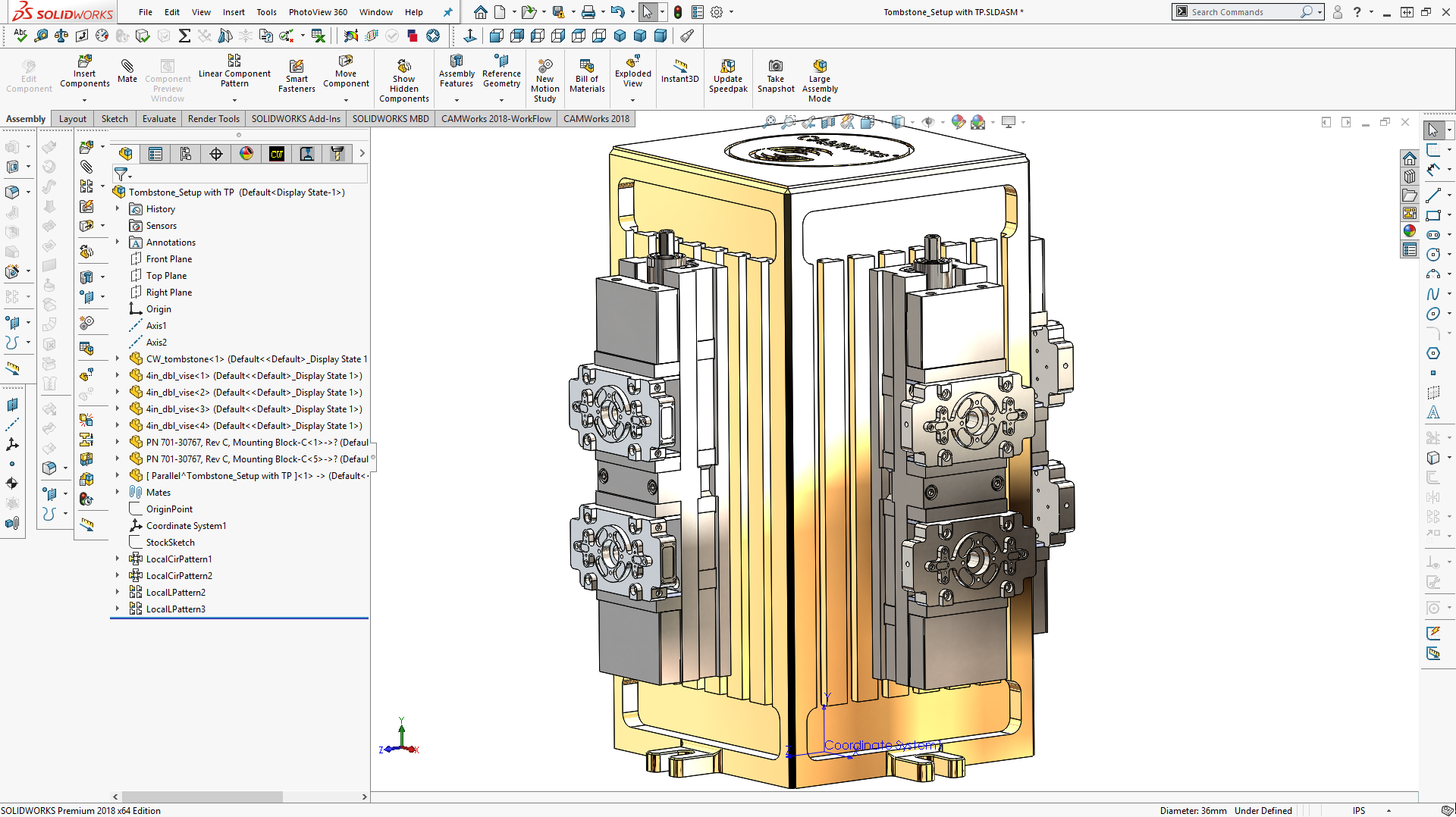 In SolidWorks assembly mode, you can perform joint processing of several parts, program processing a series of parts, or completely simulate all the actual situation on the machine table — all the rigging, preparation of any complexity, and so on — to take the processing conditions into account at the earliest stages creating a program.