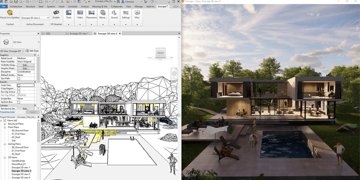 Enscape 3D 2024 often run in conjunction with Revit or SketchUp, reflecting all the changes in the construction of the you through the real-time export. Just launch Enscape 3D just by a click and see through the project is showing full of you in seconds without the need to upload to cloud or export to other programs needed! All changes in Revit are immediately available for evaluation in Enscape. Explore the options of different designs and present your project to customers.