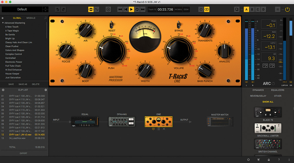 The Mastering Chain is now improved, allowing 16 modules per session (see computer minimum requirements). New modules are added: ONE module, EQual module, DynaMu module, and the MasterMatch Module. A new Assembly window lets you edit and create an industry-standard audio montage, and the improved export possibilities now include DDP 2.5 and Wav Cue and PQ sheet. Improved and even more precise metering suite with separate floating window for an even more accurate visual reference, the best in its category.