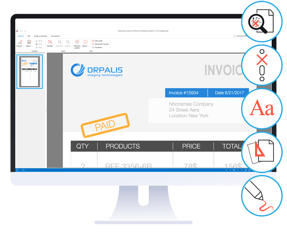 ORPALIS PaperScan Professional 4 is a powerful and comprehensive tool to manage the documents of your business or organization: scan, process, perform OCR, annotate, compress, and save your images and PDFs in various formats.