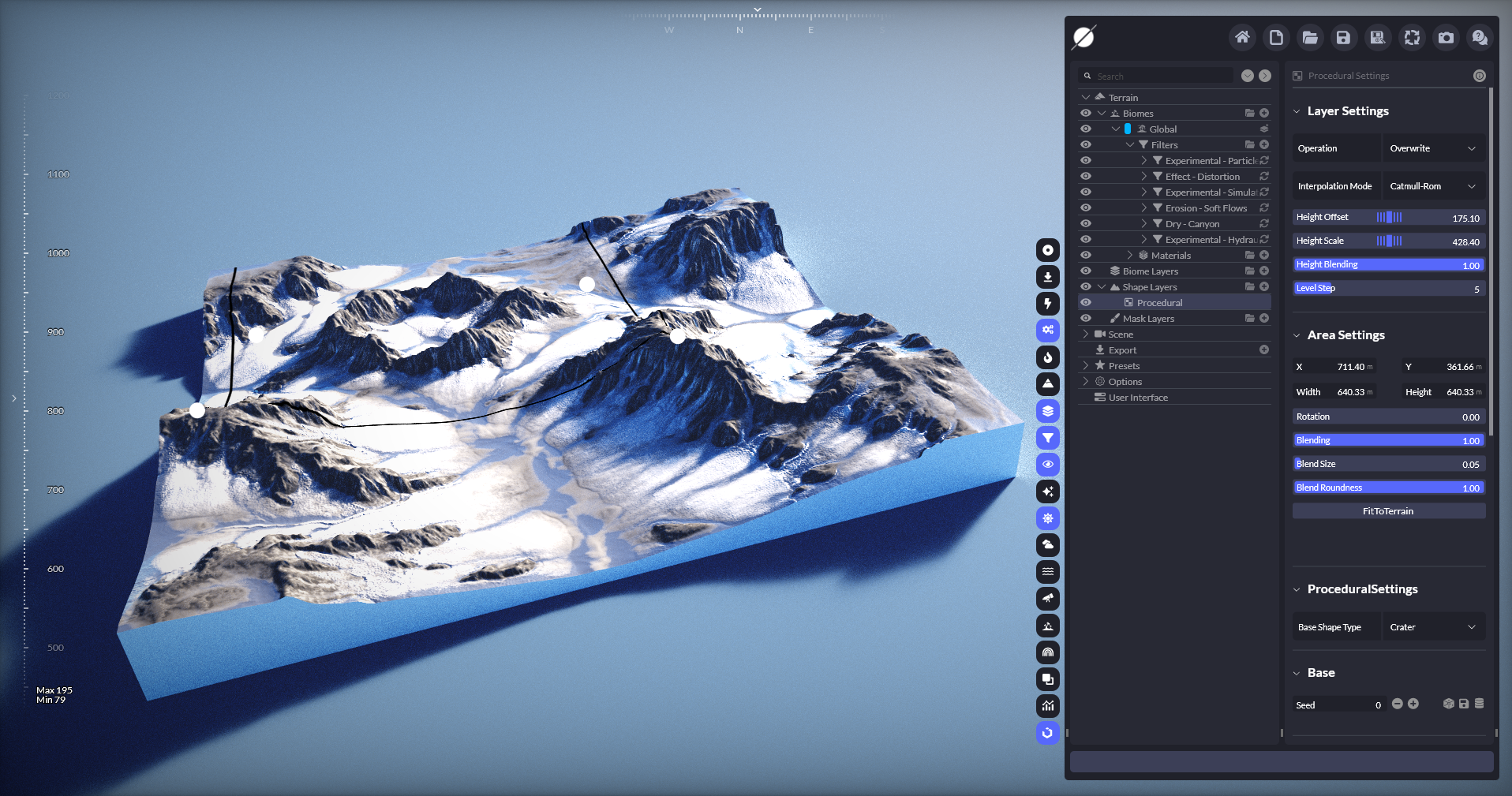 Its unique and powerful procedural generator allows you to apply and combine many different filters to modify the terrain you created or imported from another source. You can erode, create rivers and lakes, apply sediments, transform, stylize, and simulate water flow, sediment transport, sediment deposit, and much more entirely in real-time.